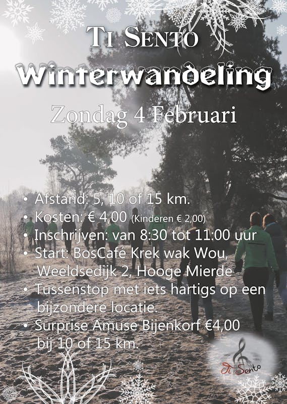 Op zondag 4 februari organiseert Ti Sento traditiegetrouw een Winterwandeling. Er zijn drie mooie droge routes uitgezet (5, 10 en 15 km) over zowel verharde als onverharde wegen. De routes leiden u door landelijk gebied en prachtige natuur. Landgoed Culitsrode wordt opengesteld voor deze wandeling, een mooie gelegenheid om dit landgoed eens te bewonderen. Ook aan de innerlijke mens is gedacht. Onderweg staat in Het Koetshuis van Academy Bartels iets hartigs voor u klaar. Tevens kunt u daar gebruik maken van toiletvoorzieningen.