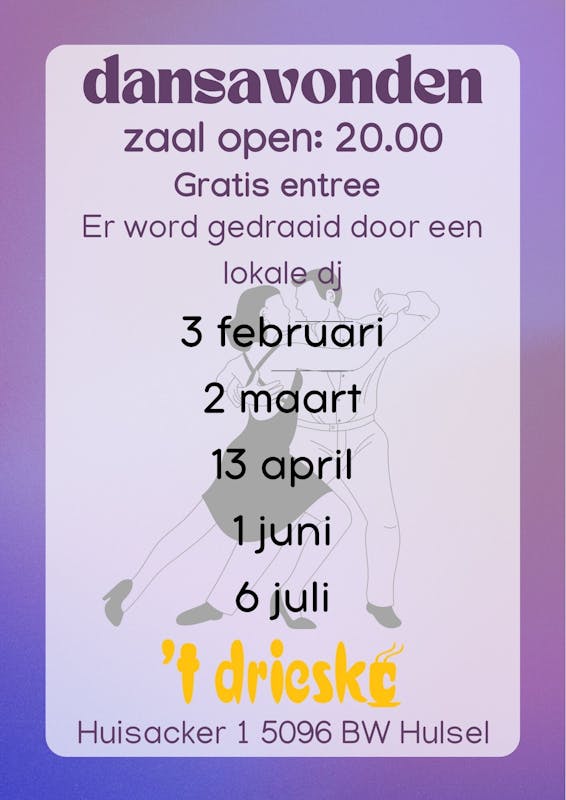 Ook in het nieuwe jaar organiseren we weer dansavonden, muzikaal omlijst door onze ervaren dj. U gaat een gezellige avond beleven waarbij alle dansen aan bod komen, ook los dansen is mogelijk.