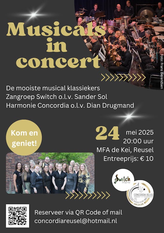 Harmonie Concordia en Zanggroep Switch bundelen de krachten en brengen op 24 mei 2025 de mooiste musicalklassiekers naar MFA De Kei in Reusel! Van meeslepende medleys tot Seasons of Love en Concert Celebration – een avond vol muzikale hoogtepunten. .