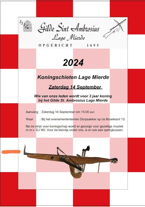 Iedereen is welkom, jong en oud! Dit jaar vindt het Koningschieten plaats op het evenemententerrein, zodat iedereen vanaf het terras een goed overzicht heeft en de wedstrijd optimaal kan volgen. Een live scorebord zal de punten van de schutters bijhouden. Wie wordt de nieuwe koning van het Sint Ambrosiusgilde in Lage Mierde voor de komende drie jaar?