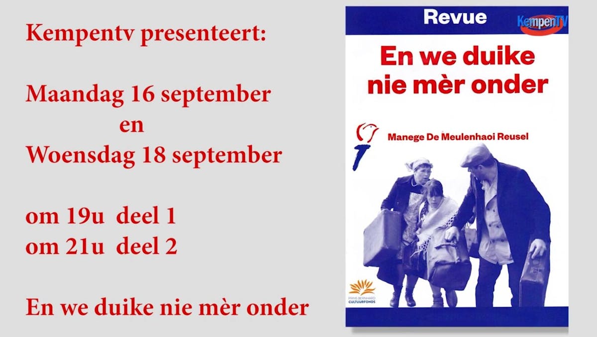 Op 3 oktober 2019 werd het feit herdacht dat Reusel-de Mierden precies 75 jaar geleden werd bevrijd. De Heemkunde Werkgroep Reusel heeft daar toen veel aandacht aan besteed middels een officiële herdenking, een expositie, een herdenkingsconcert en de opvoering van de oorlogsrevue: "En we duiken nie mèr onder". Heb je altijd de revue nog eens willen terugkijken? Dit is je kans.