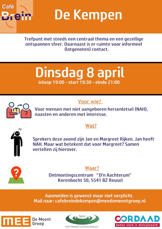 Dinsdag 8 april 2025 organiseert Café Brein De Kempen een ontmoetings- en informatieavond voor mensen met Niet-Aangeboren Hersenletsel (NAH).