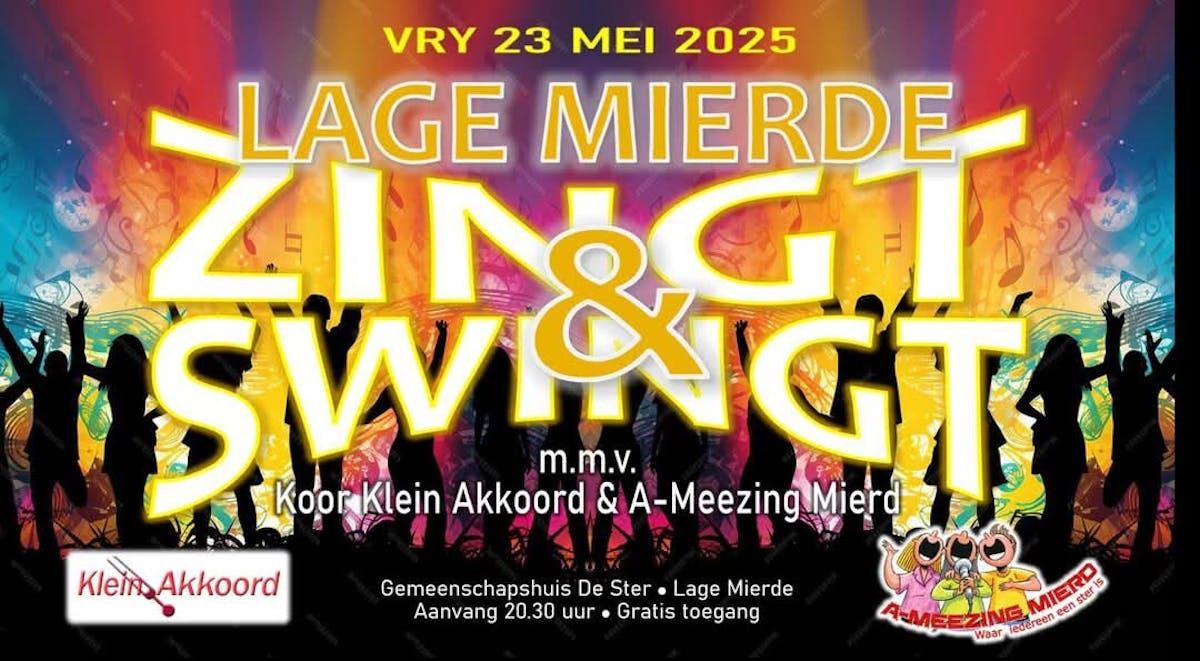 Lage Mierde zingt en swingt, een samenwerking van koor Klein Akkoord & A-meezing Mierd die voor jullie een gezellige zing en swing avond verzorgen.