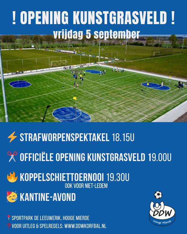 Korfbalvereniging DDW nodigt alle leden, supporters en sportliefhebbers uit voor een feestelijke en sportieve avond ter ere van de officiële opening van het gloednieuwe kunstgrasveld. Deze mijlpaal wordt op vrijdag 5 september gevierd op sportpark De Leeuwerik in Hooge Mierde. Een gezellige avond met een bruisend programma vol activiteiten voor jong en oud.