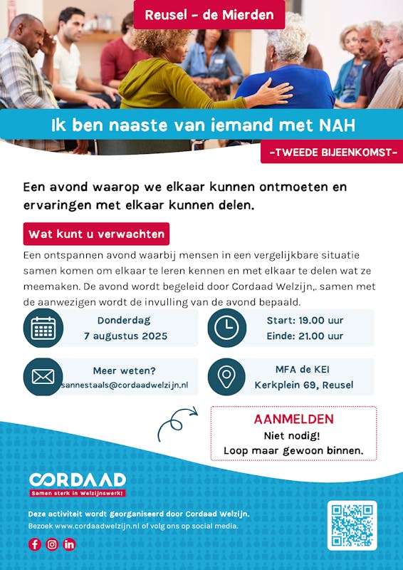 Cordaad Welzijn organiseert 1x per maand gespreksavond voor naasten/familie van mensen met NAH.