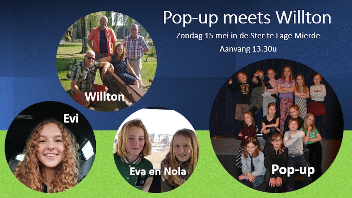 Willton met muziek uit de jaren 70, 80 die al menigmaal hun muziek ten gehore hebben gebracht op diverse muziekavonden. De bezetting wordt gevormd door Ankie Lepelaars-Lavrijsen (Zang, piano en dwarsfluit), Wil van Dijsseldonk (Gitaar en zang), Ton Lavrijsen (Zang en Cajon), en last but not least Hans van de Pol (Gitaar en zang). Willton zal tijdens de muziekmiddag fungeren als rode draad en tevens het kinderkoor Pop-up, als de 3 solisten begeleiden.