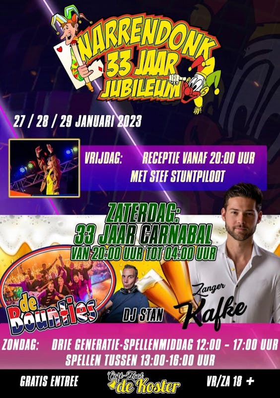 Stichting Karnaval Reusel bestaat 33 jaar in 2023. We vieren dit graag met iedereen in het weekend van 27 tot en met 29 januari 2023.