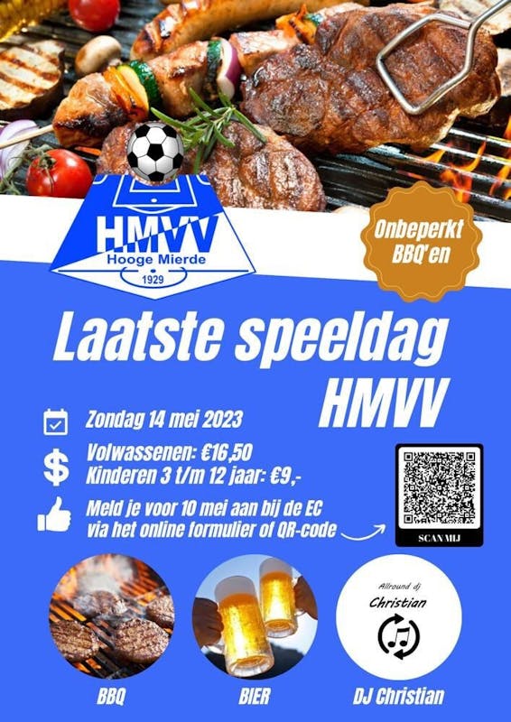 Zondag 14 mei 2023 is alweer de laatste speeldag van het seizoen 2022/23. Dit vieren wij traditiegetrouw met een sfeervolle BBQ. Dé seizoensafsluiting voor spelers/speelsters van HMVV en DDW, maar ook voor de gezinnen. Laat via onderstaand formulier weten of je erbij bent en of je alleen komt of met partner en/of kinderen. Tot dan!