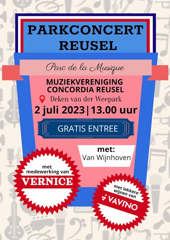 Op zondag 2 juli wordt alweer de tweede editie van het parkconcert in Reusel gegeven door muziekvereniging Concordia Reusel. Dit keer wijken we af van het BigBand thema en gaan we op de Franse tour! Het Deken van der Weepark aan de Kerkstraat wordt op deze zondagmiddag omgetoverd tot een waar ‘Parc des Buttes Chaumont’. Hierbij wordt er niet alleen voor Franse muziek en decoratie gezorgd, maar kunnen er ook verschillende wijnen geproefd worden onder het genot van een kaasplankje.