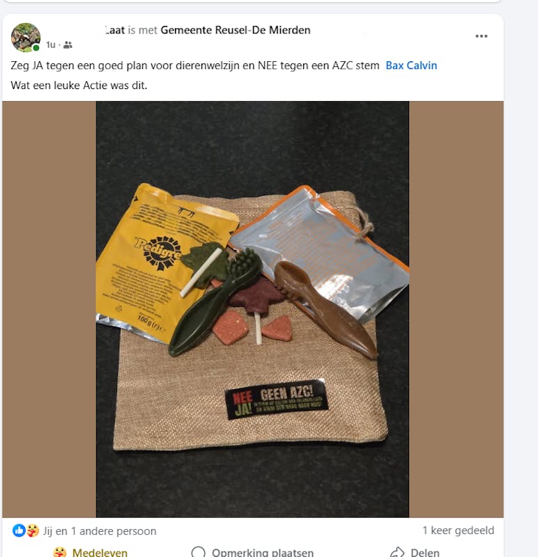 Kandidaat-gemeenteraadslid Calvin Bax (Blancolijst, onafhankelijk) heeft vandaag meer dan 150 speciaal samengestelde Sinterklaaszakken verspreid onder inwoners van de gemeente Reusel – De Mierden. De zakken, gevuld met lekkers voor de hond en een kraslot voor het baasje, werden willekeurig aan deuren bezorgd en geplaatst in diverse buurtkastjes. Met deze actie wil Calvin Bax aandacht vragen voor het tekortschietende gemeentelijk beleid rondom dierenwelzijn en de ondersteuning van inwoners met huisdieren die in (financiële) nood verkeren.