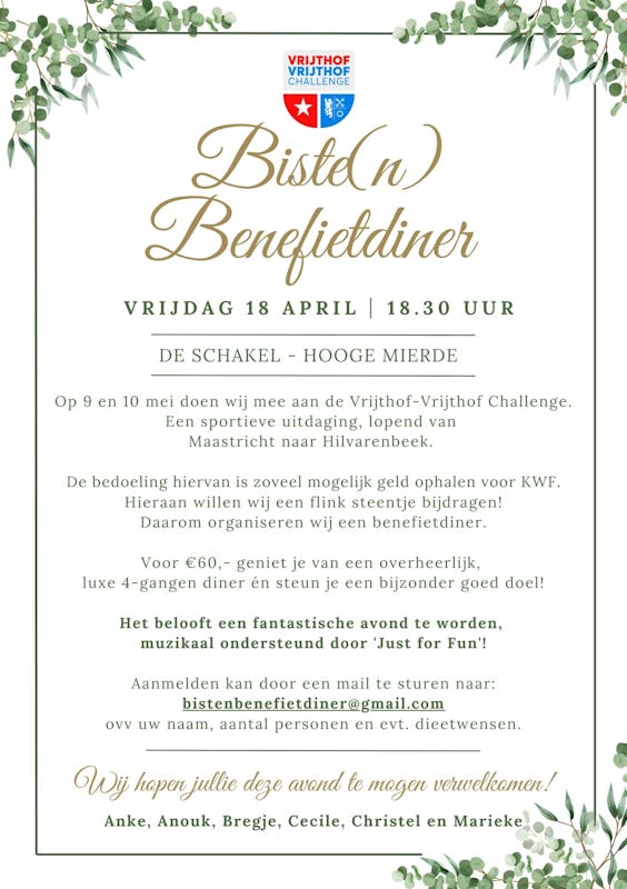 De bedoeling hiervan is zoveel mogelijk geld ophalen voor KWF. Hieraan willen wij een flink steentje bijdragen! Daarom organiseren wij op vrijdagavond 18 april een benefietdiner in MFA de Schakel.