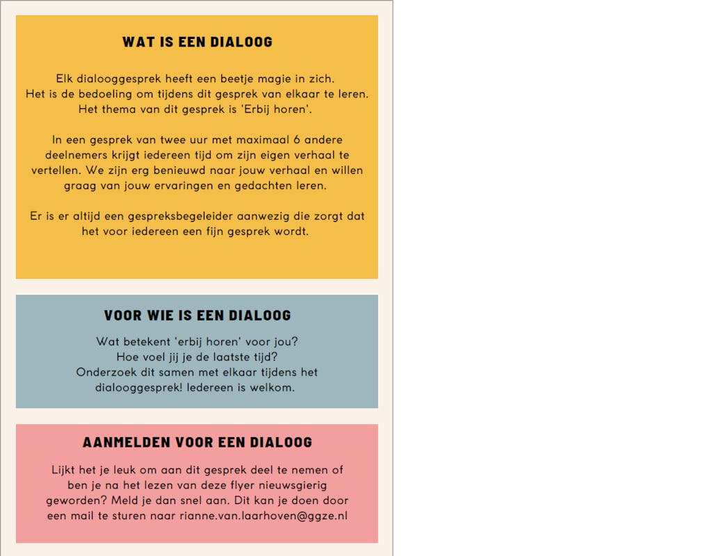 Lijkt het je leuk om aan dit gesprek deel te nemen of ben je na het lezen van deze flyer nieuwsgierig geworden? Meld je dan snel aan. Dit kan je doen dooreen mail te sturen naar