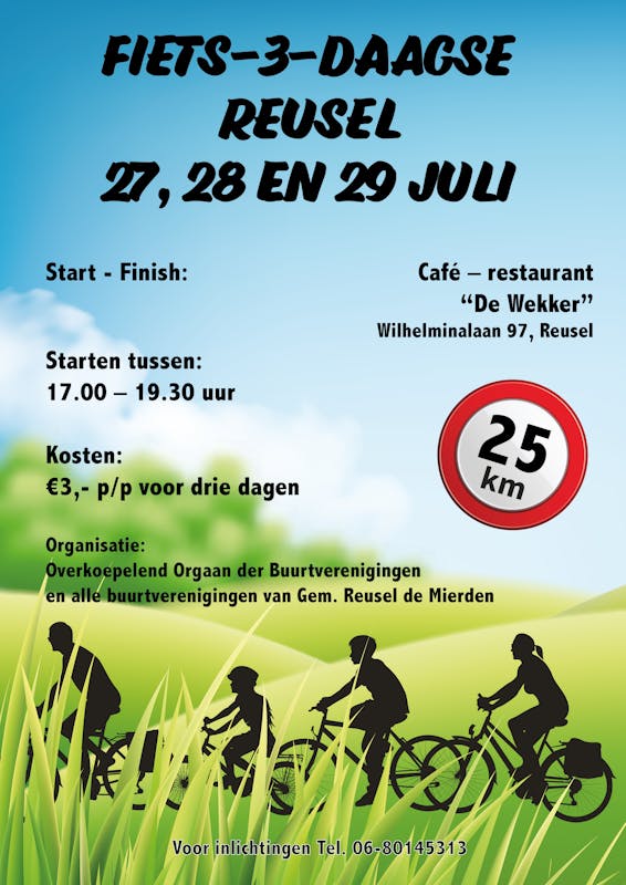 Lekker een rondje fietsen met papa of mama? Of achterop bij opa of oma? Of wil je er met enkele vrienden er een paar dagen tussenuit? In 2021 organiseert het Overkoepelend Orgaan van de Reuselse buurtverenigingen in samenwerking met onze sponsor, café-restaurant De Wekker, voor de 32e keer de Fietsdriedaagse in Reusel en omringende dorpen. Er is weer voor een drietal routes van ongeveer 25 km. gezorgd, die door het mooiste natuurschoon van Reusel en omgeving voeren. Onderweg zijn er enkele stempelposten en pauze momenten in de route verwerkt. Deze routes gaan geheel over verharde paden en wegen en de nieuwste fietspaden zijn erin opgenomen. Wie een aantal dagen onbezorgd fietsplezier wil beleven, kan zich inschrijven bij cafe-restaurant "De Wekker" aan de Wilhelminalaan 97 te Reusel. Inschrijven en vertrek elke avond van 17.00 tot 19.30 uur. De fietsdriedaagse wordt gehouden van 27 t/m 29 juli 2021. Deelname bedraagt € 3,00 voor drie dagen fietsplezier. Voor meer informatie kun je terecht bij het organiserende Overkoepelend Orgaan der Reuselse buurtverenigingen, tel: 06-80145313. Dit evenement kan op het laatste moment mogelijk worden afgelast door de gemeente i.v.m. de corona-maatregelen.