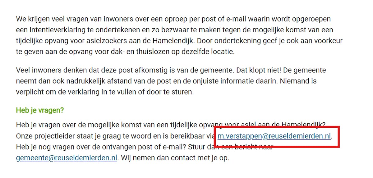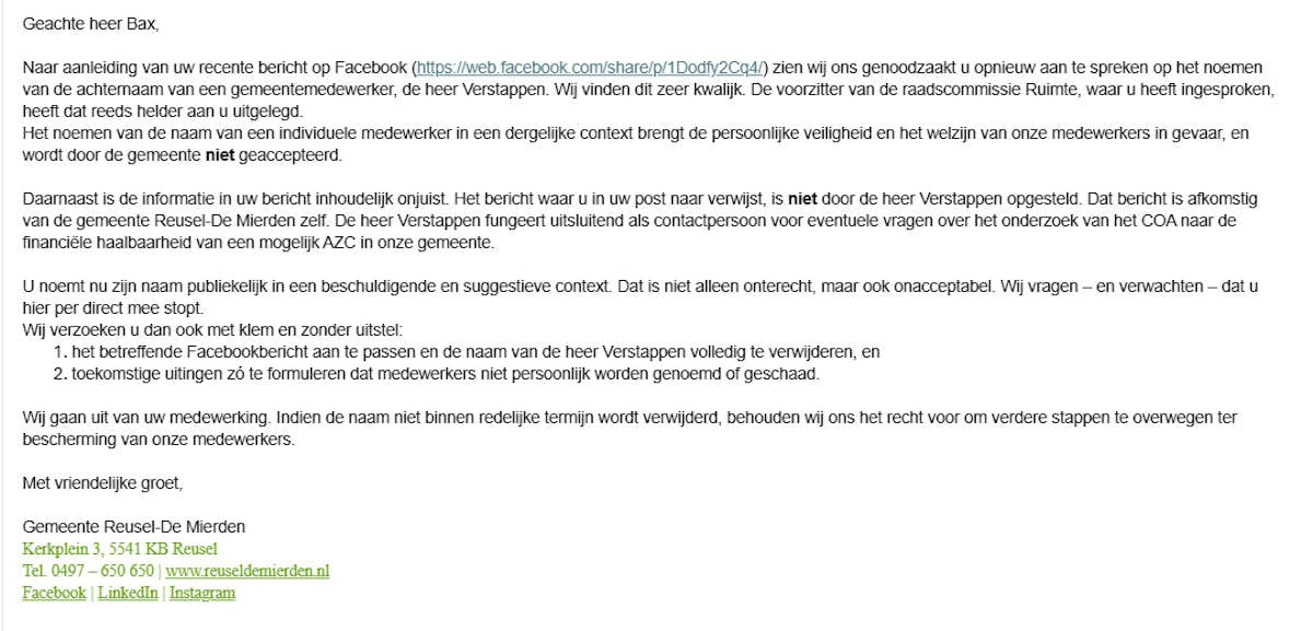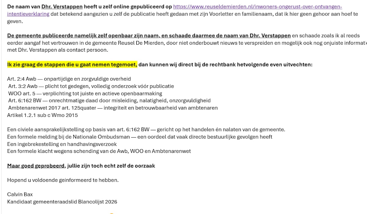 In het gemeentelijke weerwoord gaf de gemeente aan dat de naam van dhr. Verstappen, die in een socialmediabericht van Calvin Bax werd genoemd, niet openbaar gemaakt zou mogen worden uit veiligheidsoverwegingen. De gemeente dreigde met eventuele vervolgstappen.