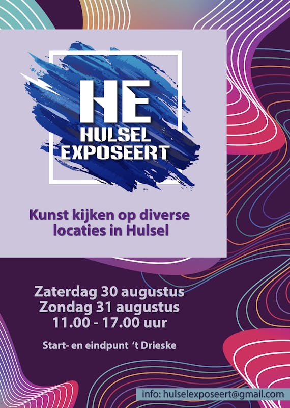 Liefst 21 deelnemers houden op zaterdag 30 en zondag 31 augustus een expositie vanaf 11.00 tot 17.00 uur. Dit evenement vindt plaats in Hulsel op negen locaties, een aantal deelnemers exposeren in eigen huis of tuin en ook in café 't Drieske zijn deelnemers die daar hun werk tentoonstellen. De volgende kunstuitingen zijn te bezichtigen: schilderijen - fotografie - beeldhouwen - houtbewerking - goudsmid - keramiek - houtsnijwerk - glas in lood - haken. Beginpunt van de route is café 't Drieske, hier is ook een plattegrond verkrijgbaar waarop de locaties staan vermeld. Op elke locatie zal een vlag zichtbaar zijn met het logo van Hulsel Exposeert. We hopen op een zonnig weekend waar we veel bezoekers mogen verwelkomen.