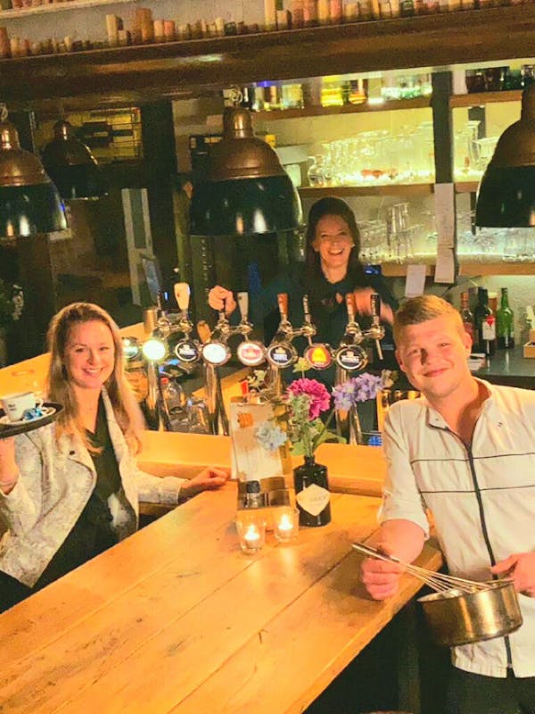 Ja, maar een eigen restaurant is altijd zijn droom geweest. Ik heb het er al eens eerder met hem over gehad. En nu komt deze kans voorbij, in zijn eigen dorp, in zijn eigen stamkroeg zelfs. Hij is erg enthousiast. Dat zijn we trouwens allemaal. Drie jonge mensen die er voor gaan. Nieuw leven erin. Sandra is nog maar 24, maar zij werkt hier al tien jaar. Zij is een Lage Mierdse. Nu is ze nog kinderverpleegkundige in het ziekenhuis. Maar ze zegt: horeca, dat is echt mijn ding!
