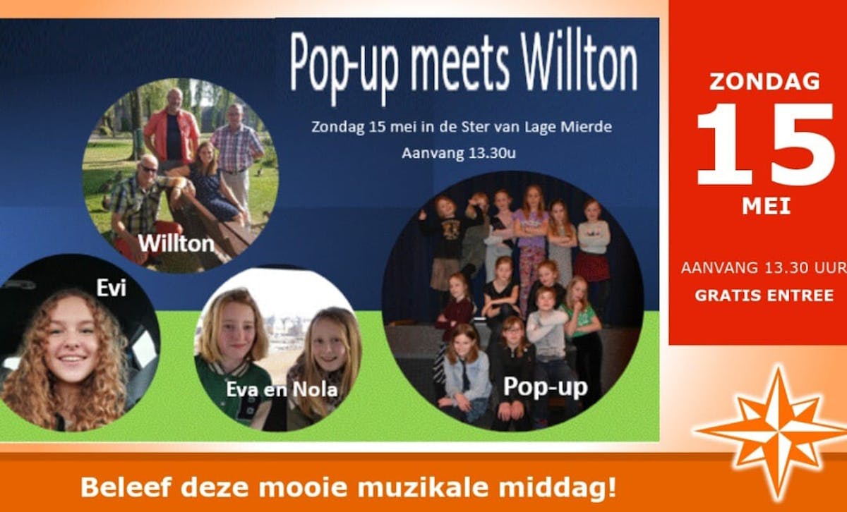 Komende zondagmiddag 15 mei in de Ster in Lage Mierde de hele middag optredens van Willton, Kinderkoor Pop-up en 3 zangleerlingen van zangdocente Britt Daniëls. Gratis entree met gegarandeerd een gezellige en muzikale middag!