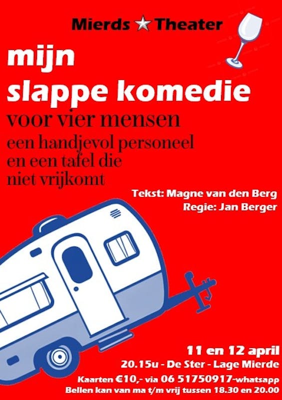 Op vrijdag 11 en zaterdag 12 april speelt het Mierdsster Theater "Mijn slappe komedie voor vier mensen, een handjevol personeel en een tafel die niet vrijkomt"