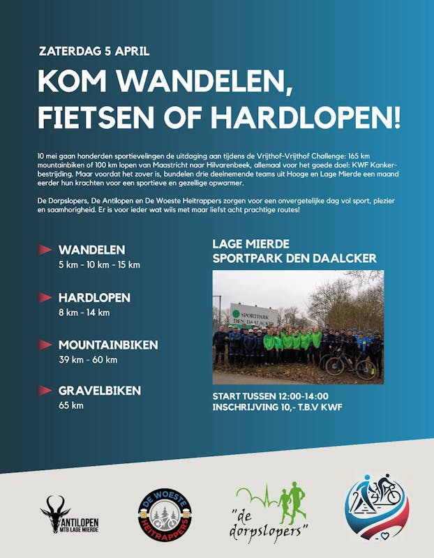 Kom wandelen, fietsen of hardlopen voor het KWF op zaterdag 5 april.