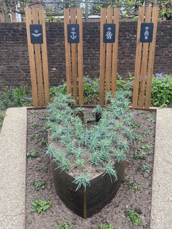 Het kunstwerk bestaat uit vier zuilen, waarop de logo’s van de verschillende krijgsmachtonderdelen te zien zijn. Voor de zuilen is, in de vorm van de V, een perk van witte anjers geplaatst – hét symbool van erkenning, respect en waardering voor de veteranen.