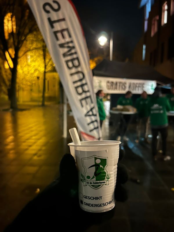 Wie woensdagavond na 18u ging stemmen op het gemeentehuis in Reusel kon er niet om heen: de koffietent van v.v. de Zuiderburen. De Reuselse voetbalclub had bij het ingaan van de avond in allerijl, pontificaal bij de ingang van het gemeentehuis, een tent opgetrokken. Aan een zijde prijkte een niet te missen banner met de tekst ‘Gratis koffie’. Een kleine tiental leden van de club trotseerden de kou om koffie uit te delen aan stemmers, maar bovenal om hun verhaal te vertellen.