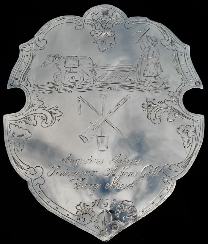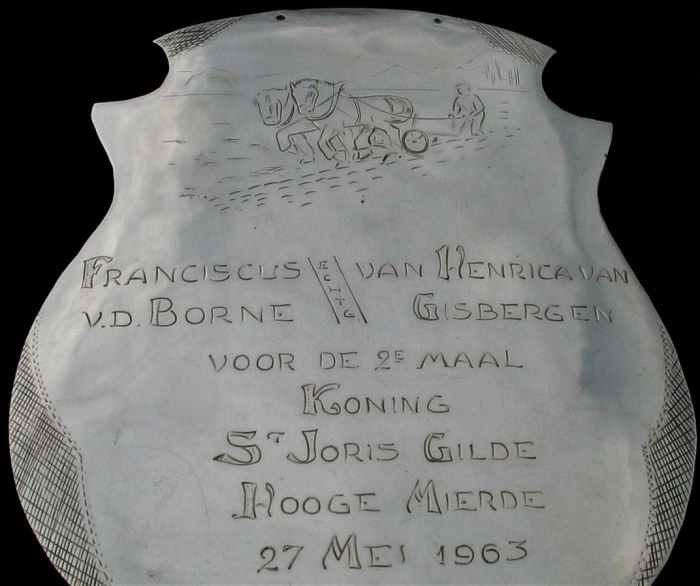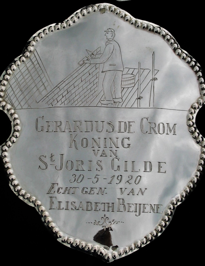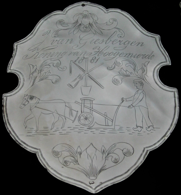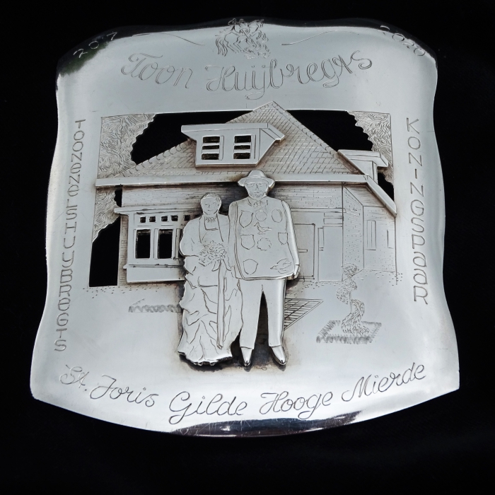 Jan is dan nog een jonge boer, 27 jaar oud, pas getrouwd en net voor de eerste keer vader. Hij kan zijn centen op dat moment ongetwijfeld beter gebruiken dan aan een groot en uitbundig koningsschild. Vandaar ook hier de wat bescheiden uitvoering. Het is ook niet door een echte zilversmid gemaakt.