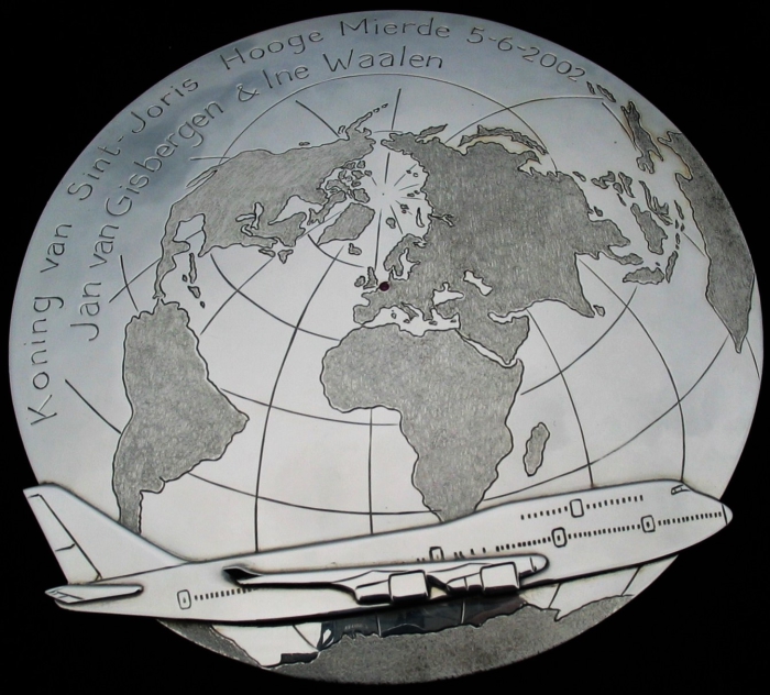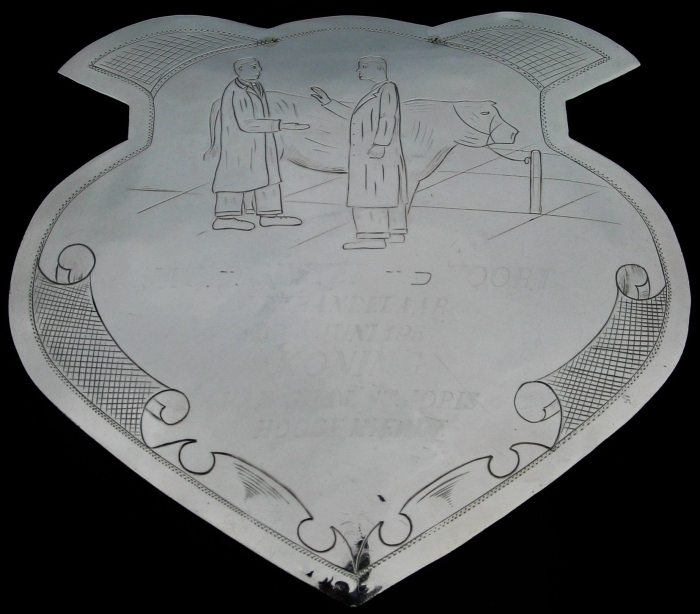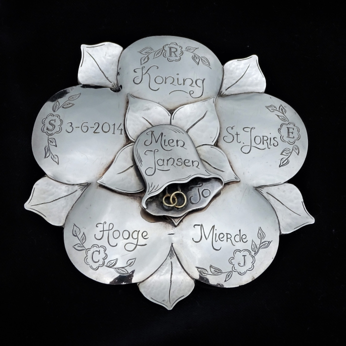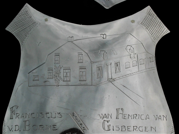 Dit schildje is het meest eenvoudige dat we hebben. Niet door een echte zilversmid gemaakt, geen versiering of uitbeelding, en een niet goed geplande gravure van de namen.