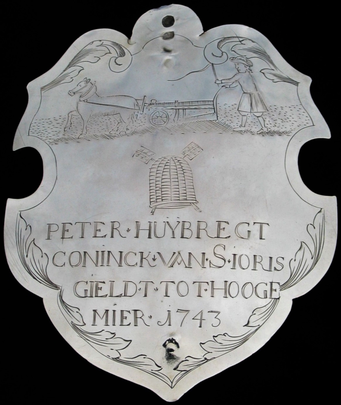 Dit is een van de fraaist gegraveerde oudere schildjes, met veel detail. Achter de ploegende boer staat op de horizon een molen, ongetwijfeld een verwijzing naar zijn achternaam.