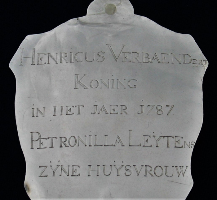Het opschrift is heel ondiep ingegraveerd. Na zestig jaar zilver poetsen zijn de letters al bijna verdwenen. Dit schildje is dus dringend aan restauratie toe.