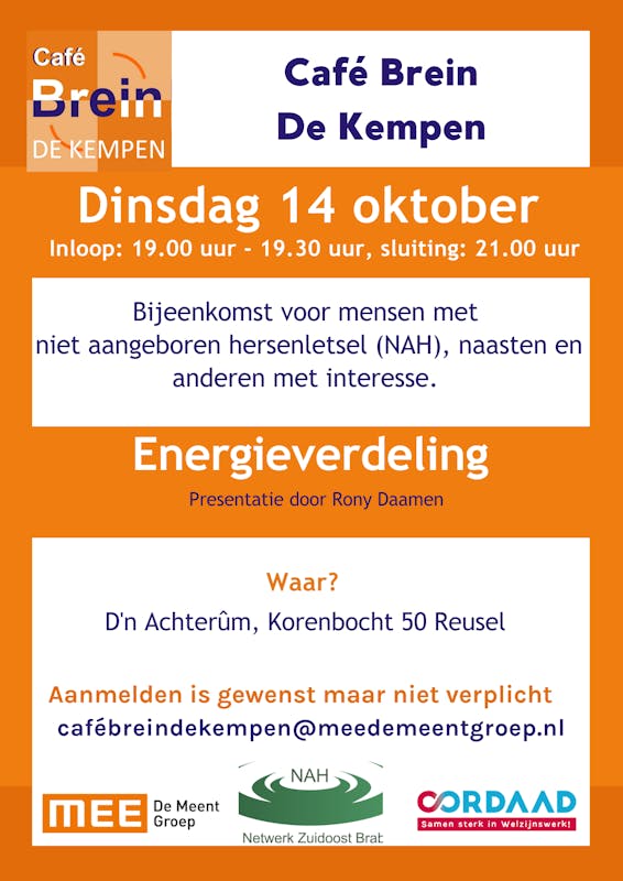 Café Brein is de tweemaandelijkse ontmoetingsavond voor mensen met NAH, mantelzorgers en andere betrokkenen waarbij informatie en gezelligheid samengaan. Met steeds een ander onderwerp met betrekking op NAH en verschillende gastsprekers praten bezoekers over de brede gevolgen van NAH en hoe je er mee om kan gaan.